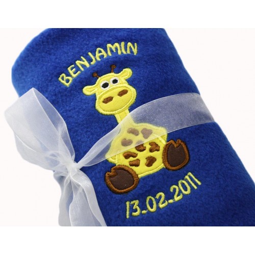 Gorgeous Personalised Soft Touch Baby Embroidered Blanket Gift for a Baby Boy, with cute Fat Giraffe Design. Your babies name will be embroidered above, you can add a date of birth as well if you wish. The blanket will be tied with beautiful Organza Ribbon to make your gift extra special.